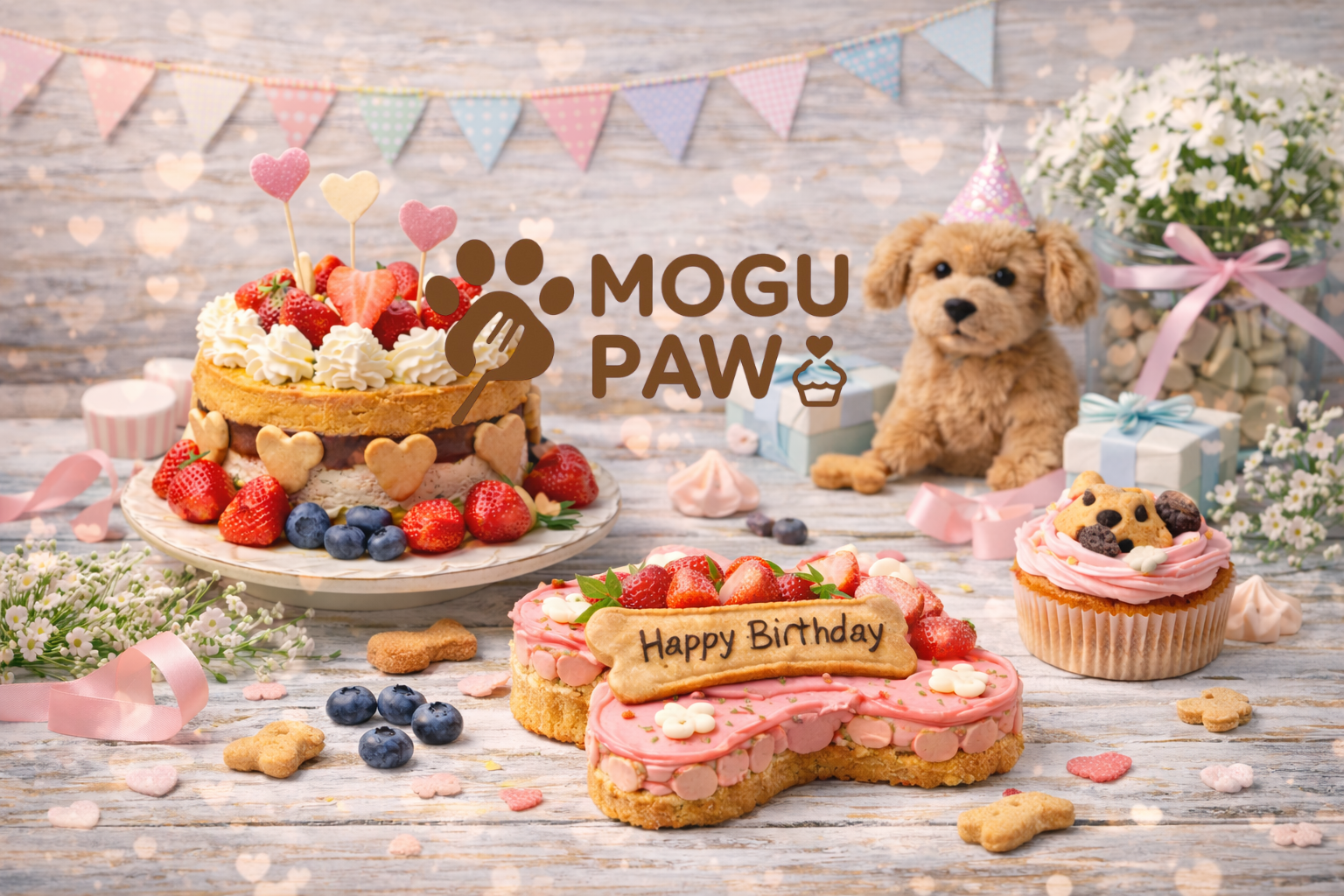 MOGU PAWは、わんちゃんの誕生日やうちの子記念日を彩るオーダーケーキを、ひとつずつ手作りでお届けします。